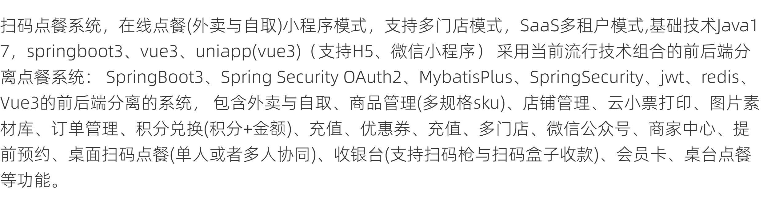 扫码点餐系统,在线点餐(外卖与自取)小程序模式,支持多门店模式,SaaS多租户模式,基础技术Java17,springboot3、vue3、uniapp(vue3)(支持H5、微信小程序) 采用当前流行技术组合的前后端分离点餐系统: SpringBoot3、Spring Security OAuth2、MybatisPlus、SpringSecurity、jwt、redis、Vue3的前后端分离的系统, 包含外卖与自取、商品管理(多规格sku)、店铺管理、云小票打印、图片素材库、订单管理、积分兑换(积分+金额)、充值、优惠券、充值、多门店、微信公众号、商家中心、提前预约、桌面扫码点餐(单人或者多人协同)、收银台(支持扫码枪与扫码盒子收款)、会员卡、桌台点餐等功能。