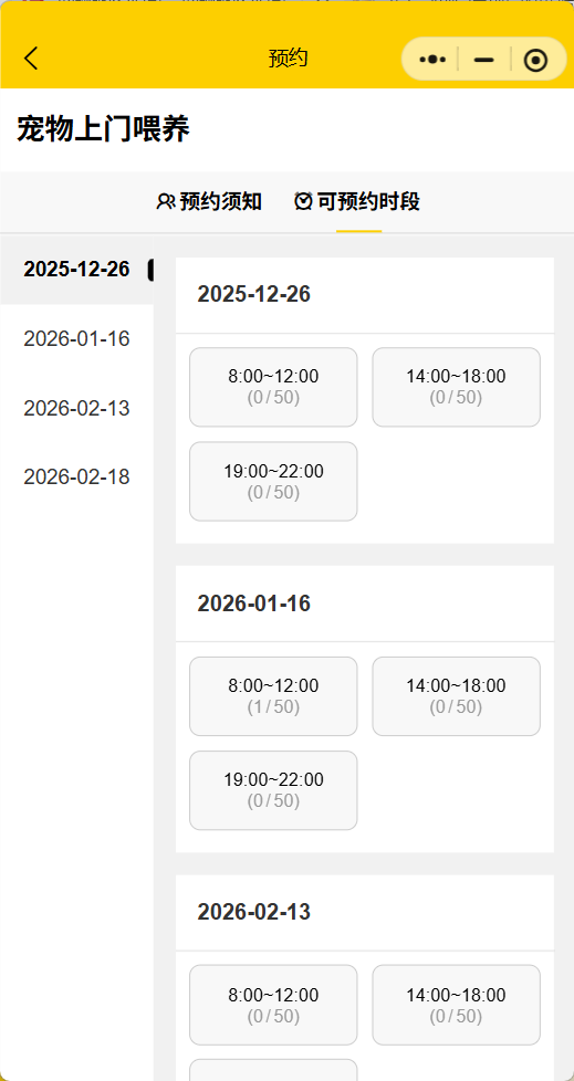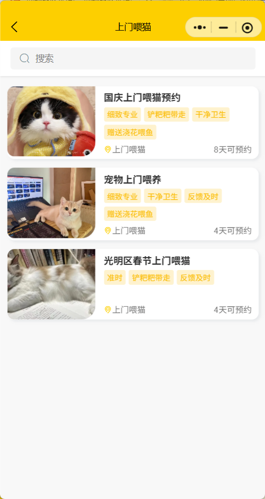 宠物服务小程序JAVA+Springboot:提供便捷的宠物服务预约平台, 帮助萌宠预约洗护、上门遛狗狗,上门喂猫,驱虫给药等;主要功能包括:展示不同服务,选择日期和时间,完成服务预约,用户查看历史订单和预约状态等