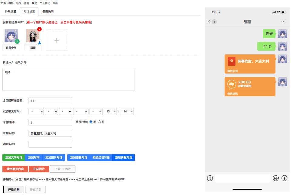 微信对话生成器,是一款聊天对话制作的工具,可以添加不同用户角色进行对话,支持发送文字、语音、图片、红包、转账等